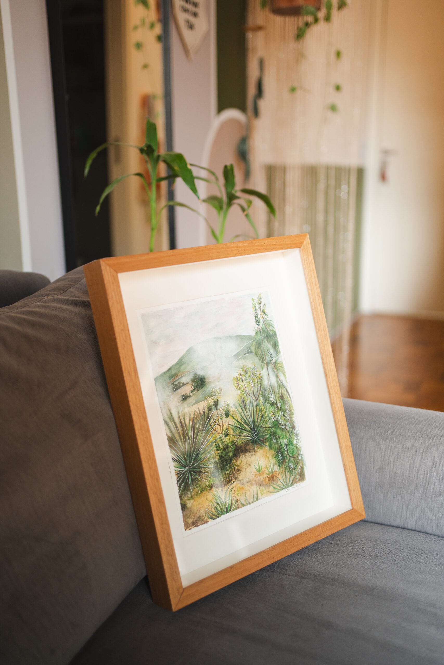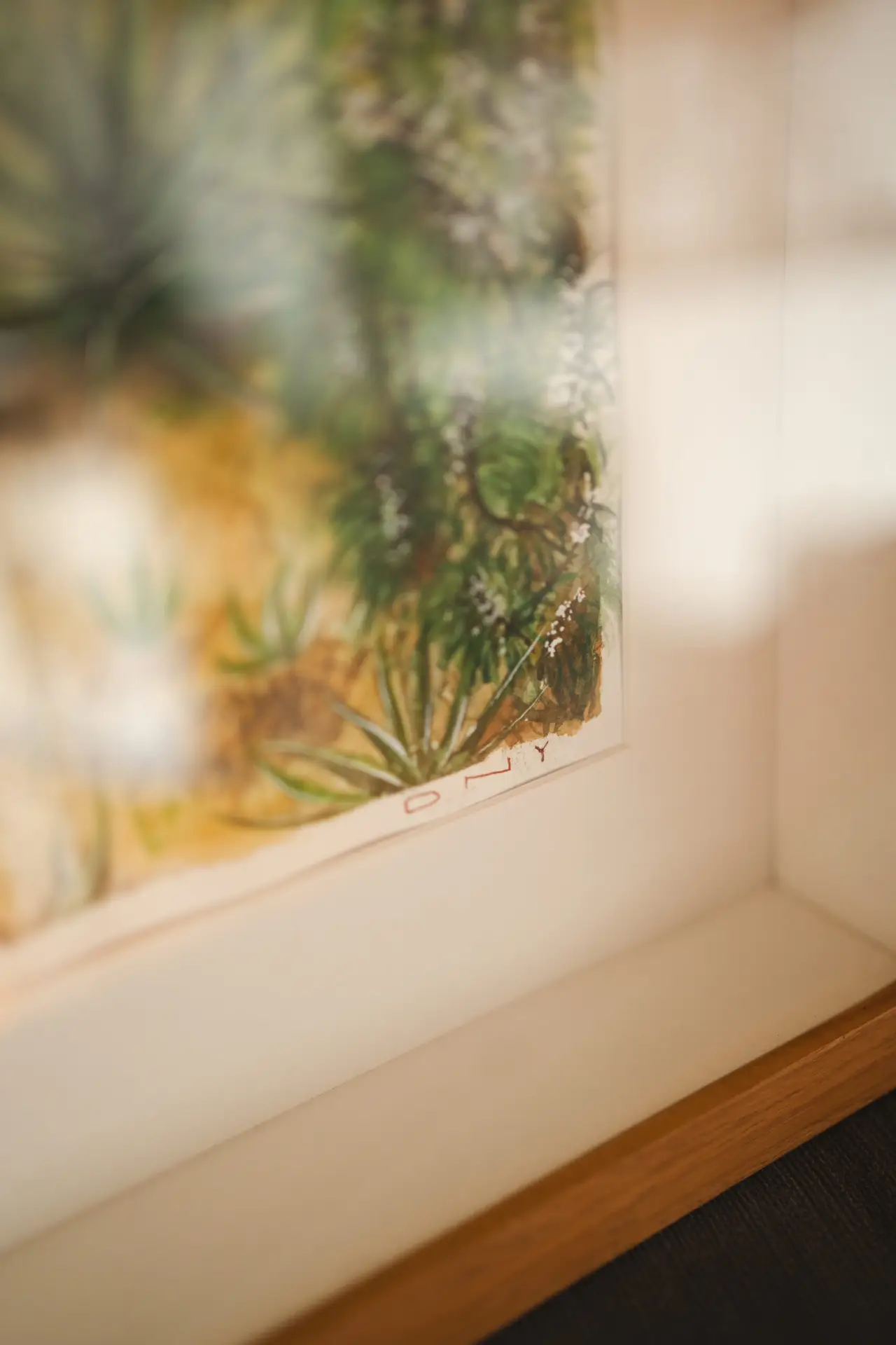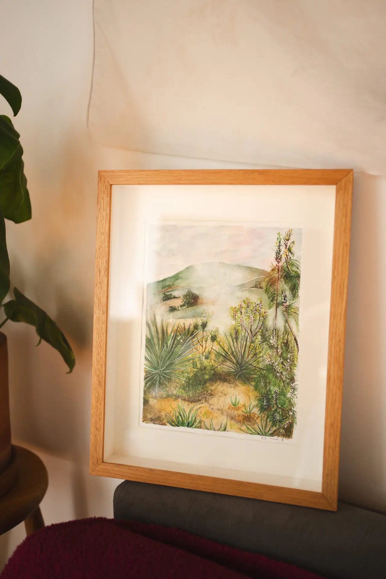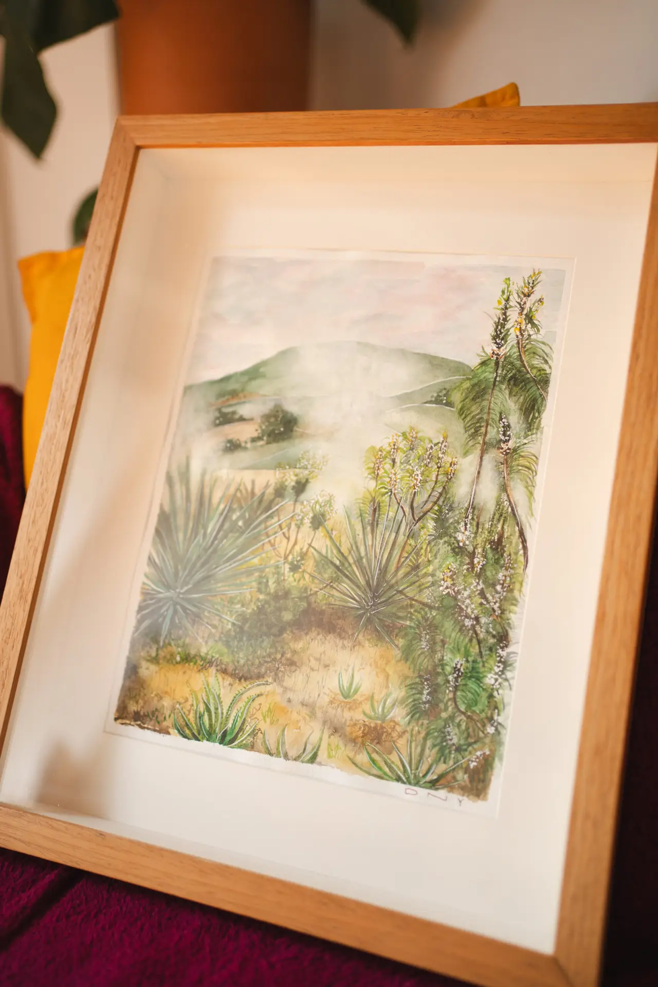 Obra feita no curso de aquarela do Instituto Tomie Ohtake, em 2023. Foi um importante passo na trajetória da artista. A partir daí, ela desenvolveu a técnica do esfumado presente em suas aquarelas. A aquarela revela a serenidade e a força do cerrado em camadas sutis de transparência. Entre tons terrosos e verdes delicados, a artista transforma a paisagem em meditação — um encontro entre técnica, tempo e contemplação.