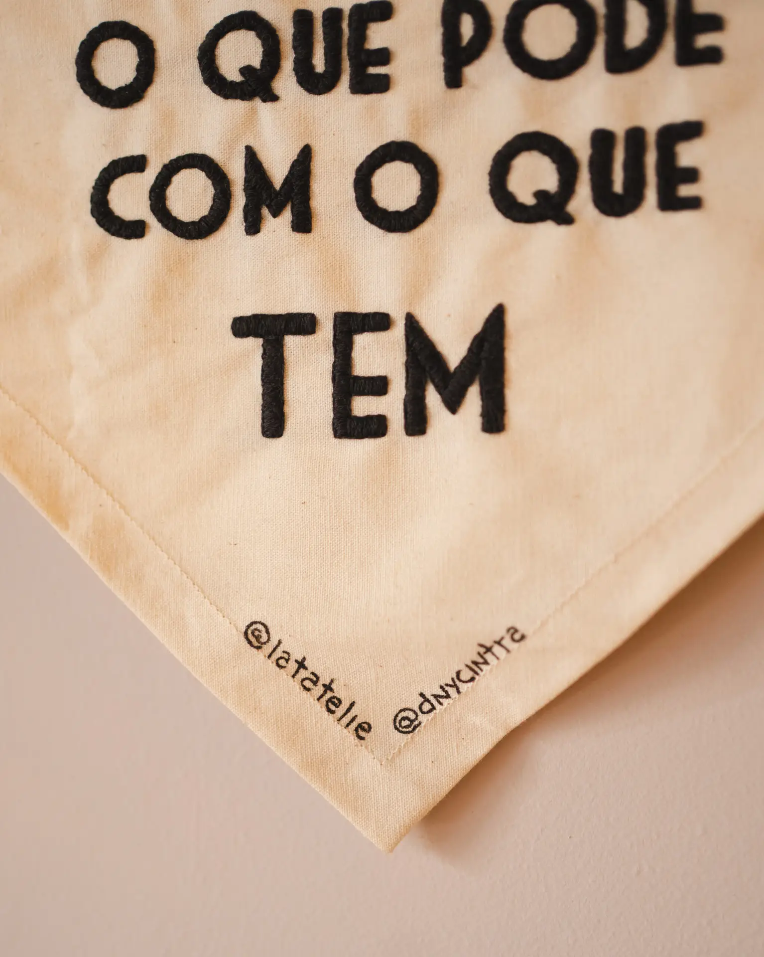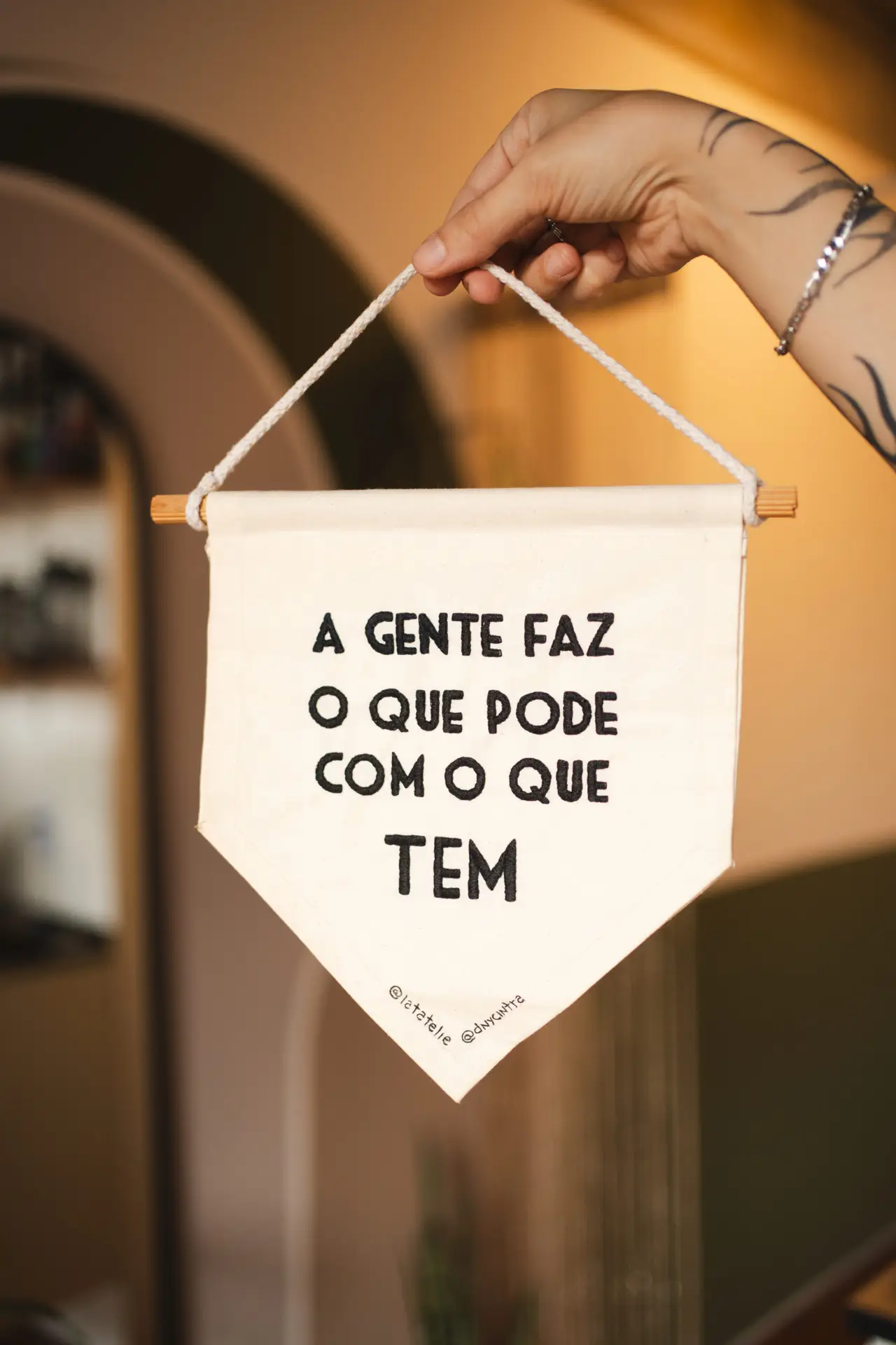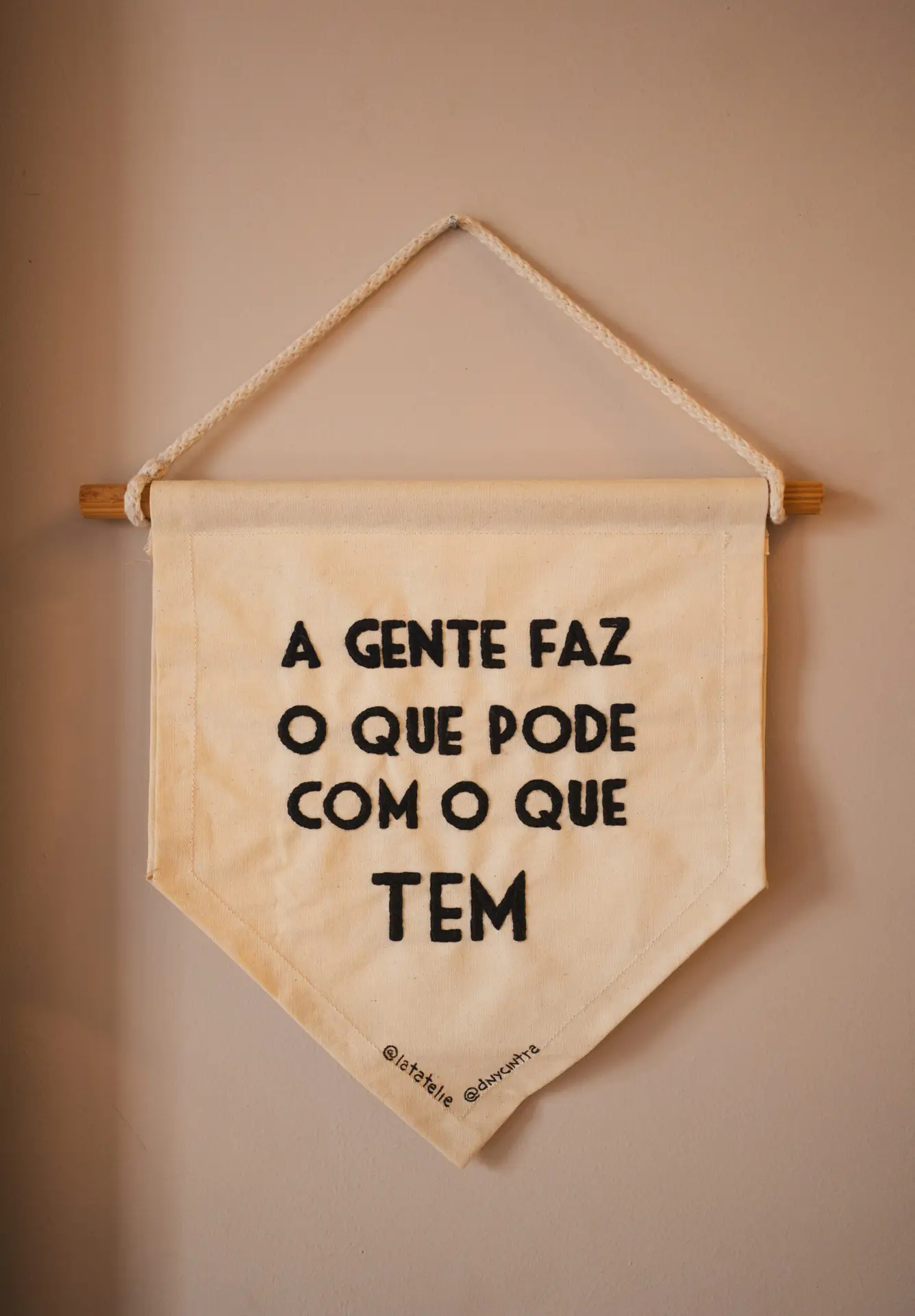 Dedicada às pequenas grandes verdades do dia a dia, esta bandeirinha dialoga com rotinas reais e convida a uma pausa reflexiva. Entre objeto decorativo e peça poética, ela ocupa o espaço com gentileza, ao mesmo tempo em que provoca reflexão e reforça a força silenciosa de quem segue criando, vivendo e insistindo. Bordada no algodão cru em parceria com @latatelie, artesã independente de Recife. Bordada no algodão cru em parceria com @latatelie, artesã independente de Recife. Obs: Com galho de bambu e corda náutica.