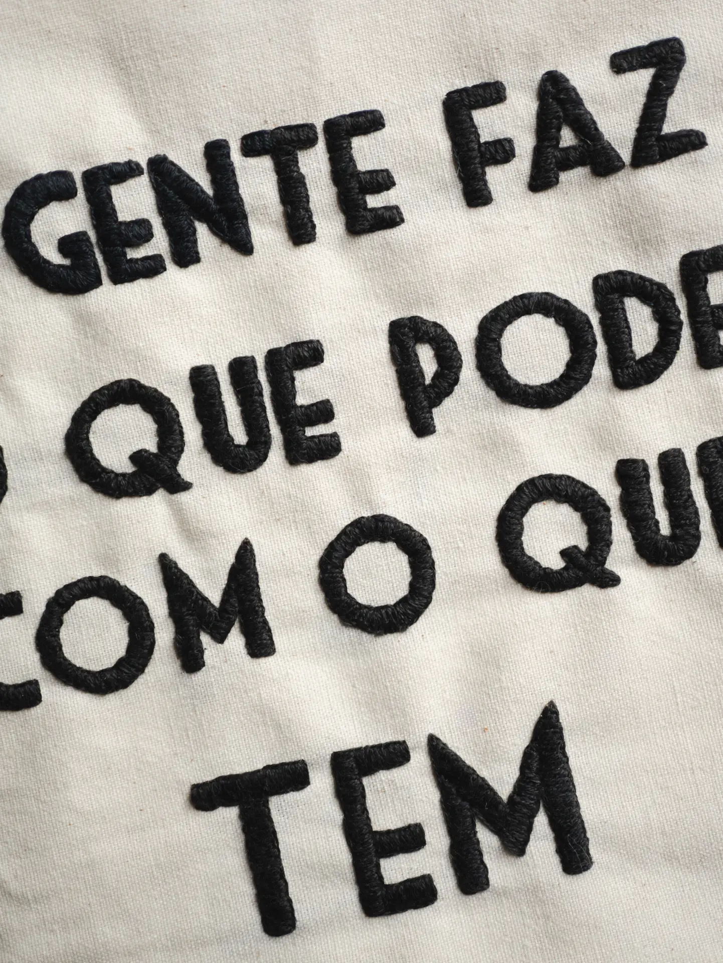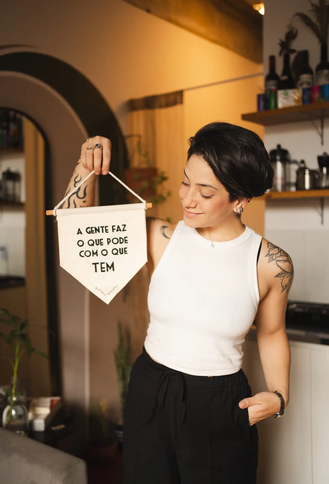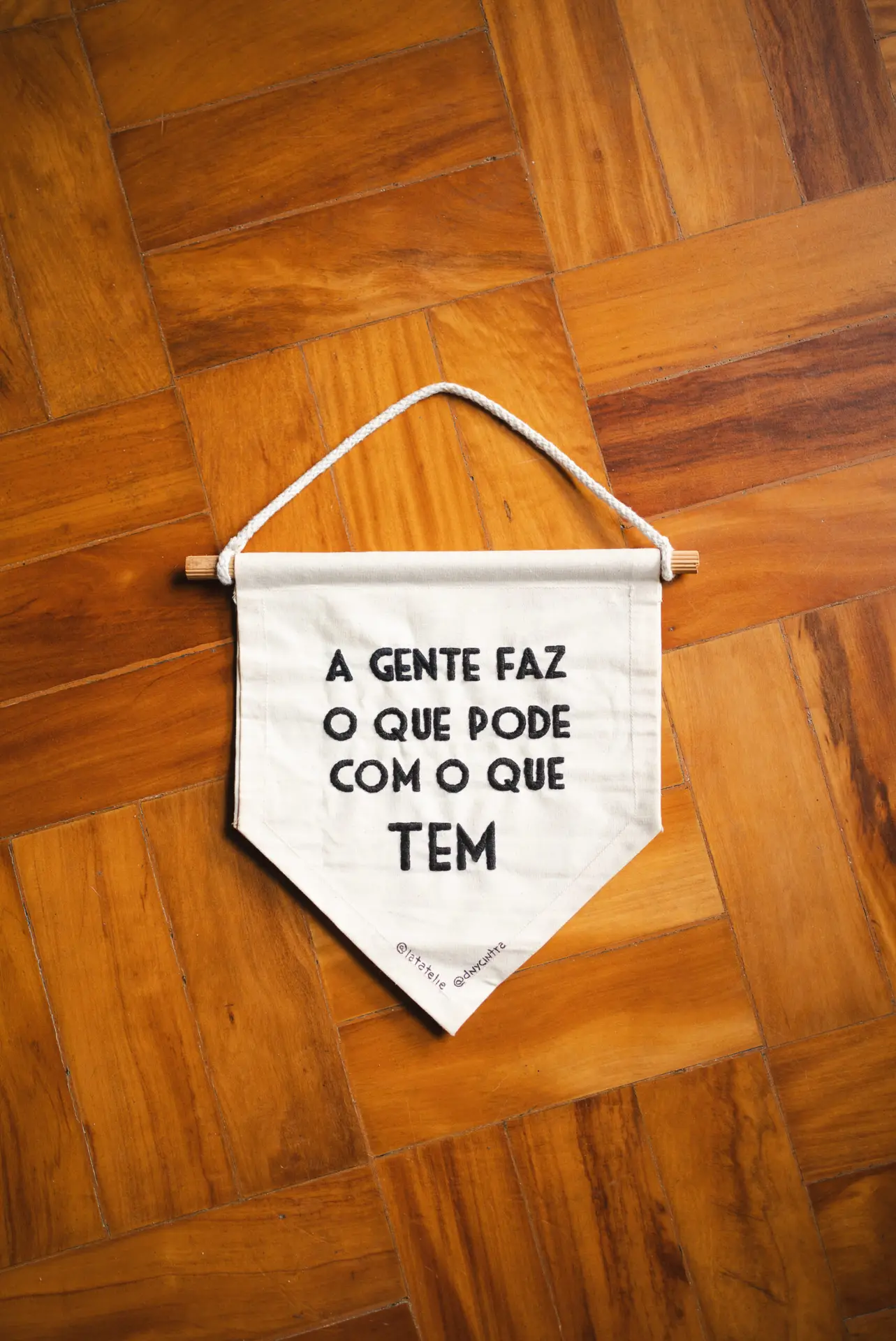 Dedicada às pequenas grandes verdades do dia a dia, esta bandeirinha dialoga com rotinas reais e convida a uma pausa reflexiva. Entre objeto decorativo e peça poética, ela ocupa o espaço com gentileza, ao mesmo tempo em que provoca reflexão e reforça a força silenciosa de quem segue criando, vivendo e insistindo. Bordada no algodão cru em parceria com @latatelie, artesã independente de Recife. Bordada no algodão cru em parceria com @latatelie, artesã independente de Recife. Obs: Com galho de bambu e corda náutica.